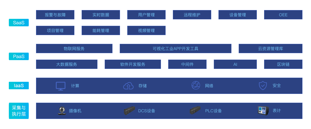 采集执行层完成现场数据的采集及设备执行,现场数据来源主要包括:顺利获得驱动采集现场PLC、仪表、摄像机等数据 IaaS层可完成计算、存储、网络、安全功能 基于9001cc 以诚为本 9001cc云的通用PaaS层给予物联网、大数据、开发平台、AI、区块链等功能 业务应用层包含了设备管理、实时数据、远程维护、能耗管理、视频管理等相关功能,共同构建完善的设备管理体系,完善设备管理工作。为设备运营维护单位给予了高效的集中式、透明化、全方位的精准运营新模式