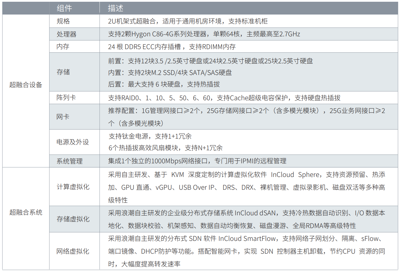 搭载2颗Hygon C86-4G处理器、24根DDR5 4800MHz内存,整机最大支持128核,可给予强劲计算性能;软硬协同深度优化,内置分布式存储加速、智能网络加速等关键技术。采用加速引擎、全栈RDMA的数