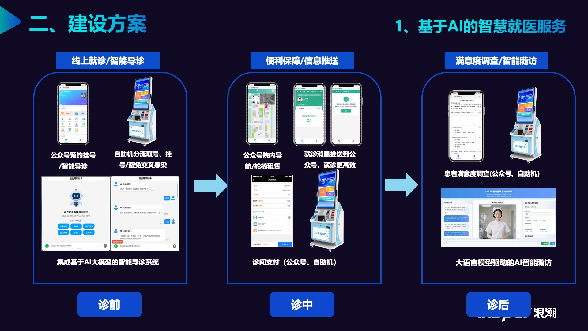 智慧就医解决方案,以 AI 为核心赋能,融合AI智能硬件、AI智慧应用及AI服务平台,构建诊前、诊中、诊后全流程数智医疗体系,有效助力医院提升就医效率与服务水平。